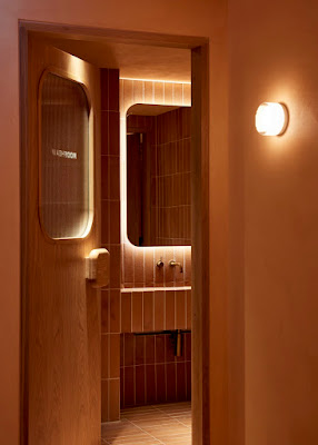 홀과 마찬가지로 테라코타 타일로 마감하여 디자인의 통일성을 줍니다. 화장실 문에 배치된 라운딩 창과 세면대 위에 달린 라운딩 된 거울이 같은 형태로 공간을 더욱 유연하게 만들어줍니다.