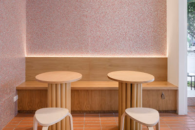 벽면에 배치된 핑크 테라조타일과 백색의 카운터 색상이 퓨어한 이미지를 형성합니다. 또한 우드 색상의 테이블과 의자들이 따스한 느낌을 연출하기도 합니다.